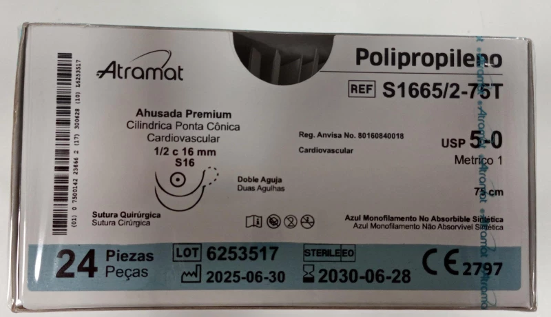 Fio de Sutura Prolene 5-0 Bi-agulhado Cilíndrica 16mm 1/2 - Atramat - Caixa com 24 Fios