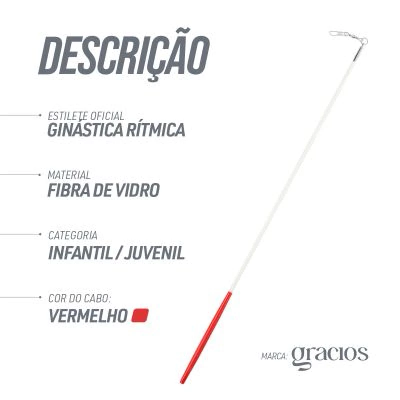 Estilete especializado para ginástica rítmica infantil da marca Pista e Campo, com 50cm de comprimento. Feito de fibra de vidro resistente, possui medidas oficiais de peso, tamanho e diâmetro para competições na categoria infantil/juvenil. Este produto de excelente qualidade inclui um girador e uma empunhadura emborrachada para conforto durante o uso. Disponível na cor branca com empunhadura vermelha. Fita não inclusa.