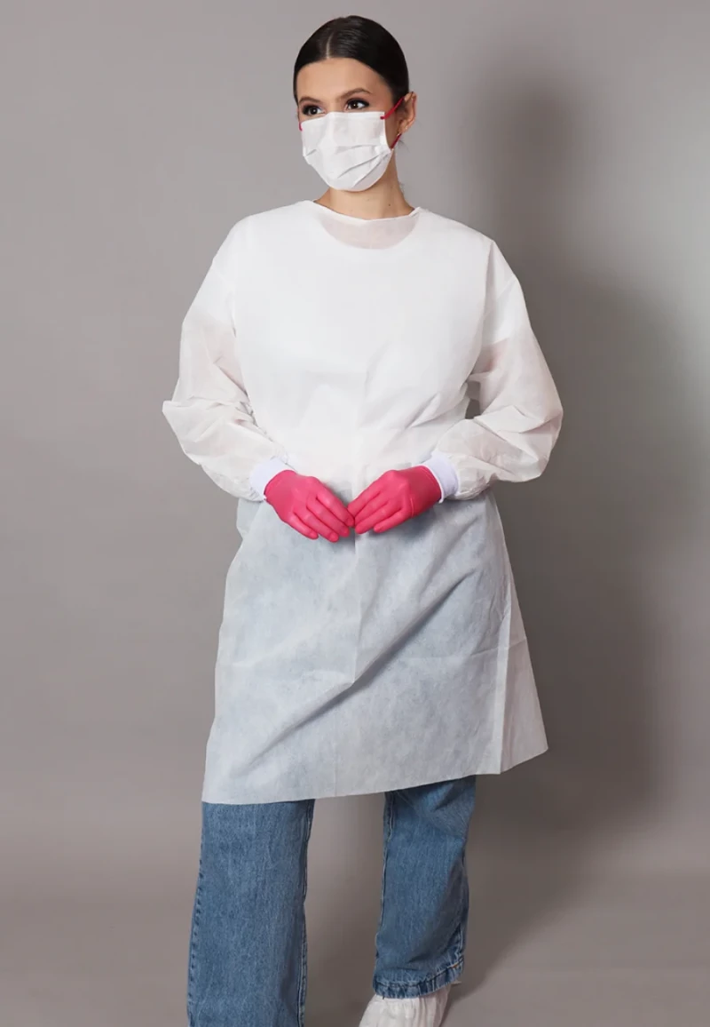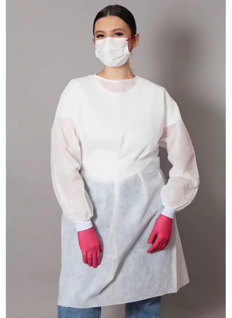 Com mangas longas terminadas em punho de tecido e tiras de ajuste no pescoço e cintura, oferece maior segurança e adaptação ao corpo do usuário. É um produto descartável, hipoalergênico e atóxico, devendo ser utilizado apenas uma vez.