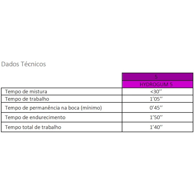 Graças à sua tecnologia avançada, o Hydrogum 5 garante reprodução de detalhes de até 5 μm, mantendo a fidelidade do molde por até 120 horas (5 dias). Além disso, é um alginato livre de poeira, com aroma agradável de mangostão e coloração lilás, tornando o procedimento mais confortável.