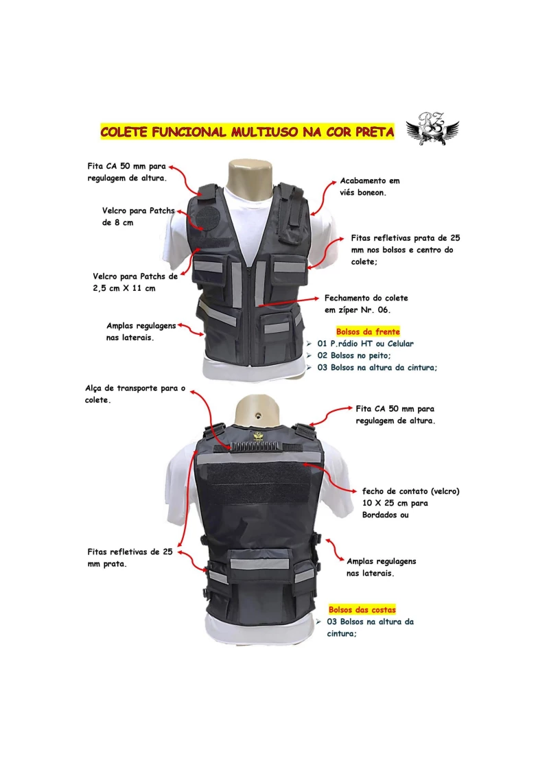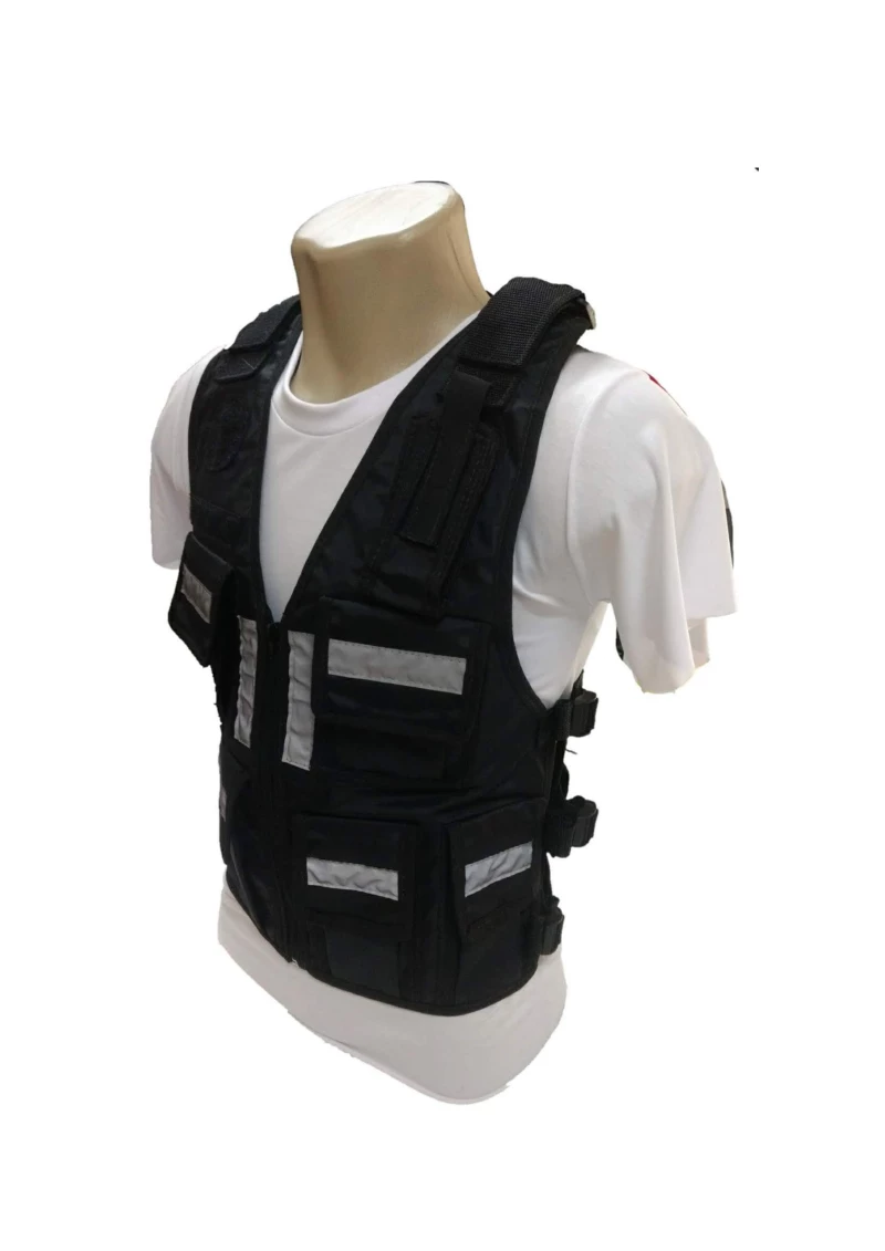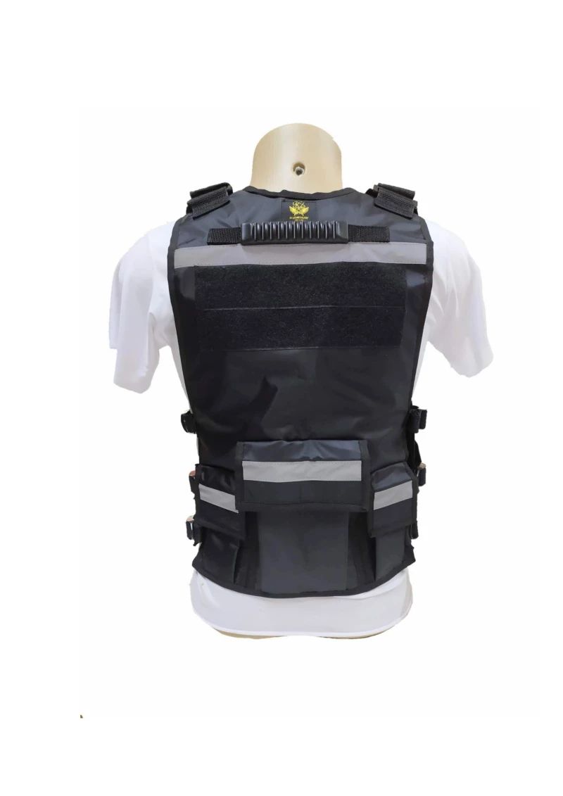 1) Fabricado em tecido importado 100% impermeável, promovendo uma maior proteção ao material distribuído dentro dos bolsos no corpo do colete;
