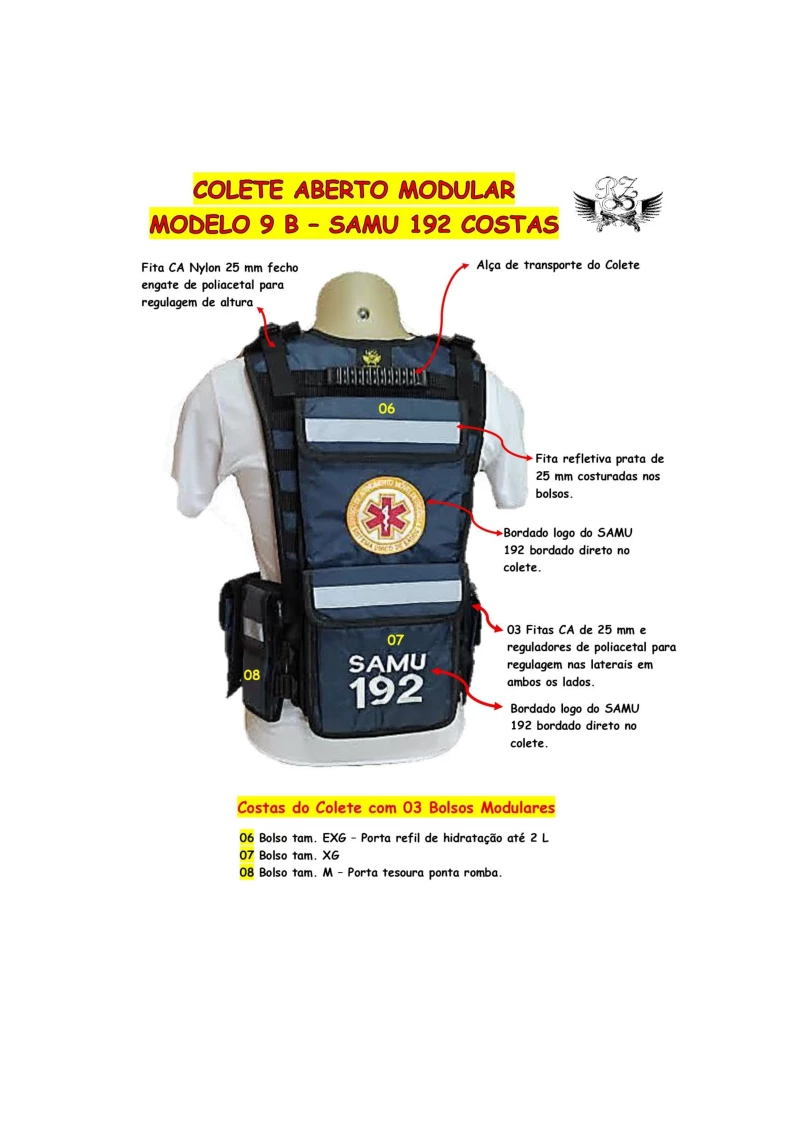 08) Dos 9 bolsos, 02 com bordado de identificação SAMU 192 e dois bolsos com bordado BRASÃO SAMU