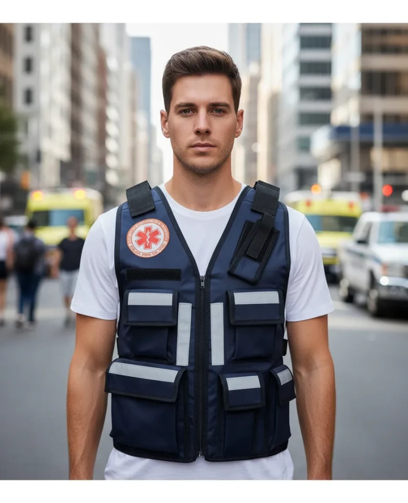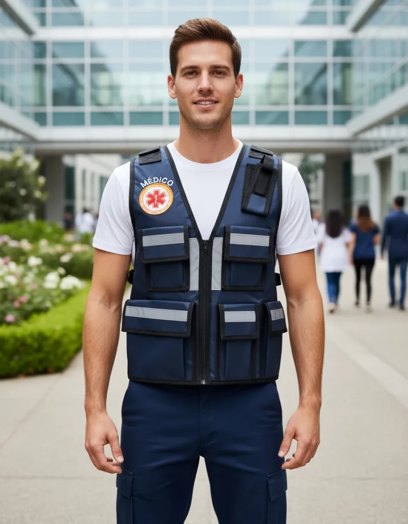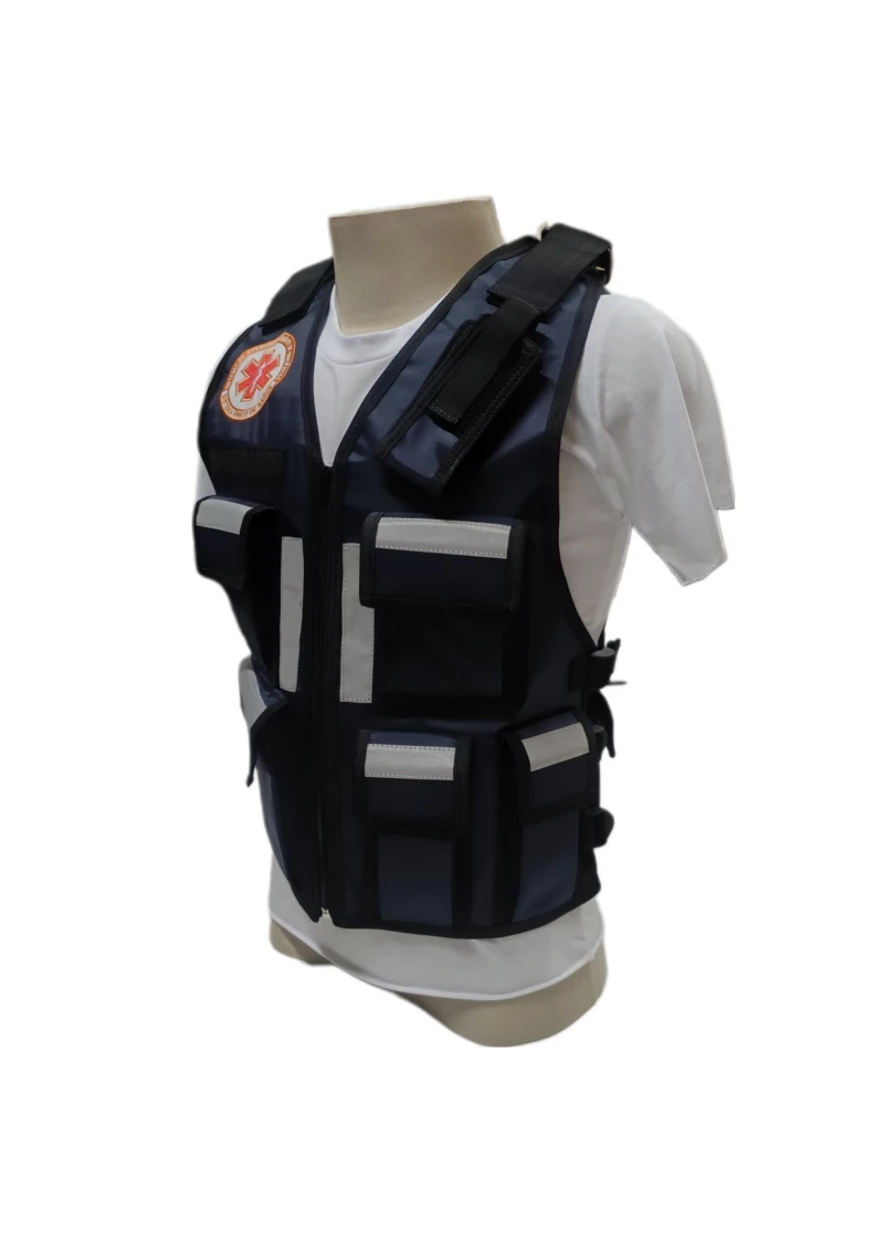 Possui bordado de identificação na frente do colete na altura do peito e nas costas.