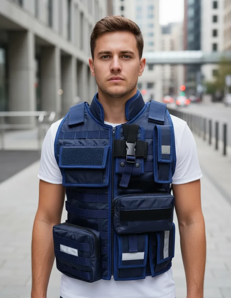 - Fitas de nylon 25 mm distribuídas pelo corpo do colete, frente e costas para adaptação dos bolsos modulares (M.O.L.L.E).