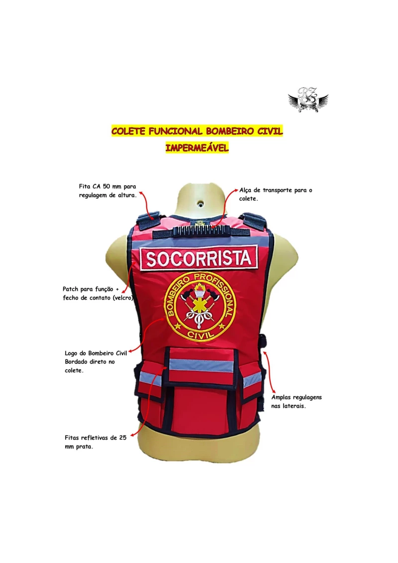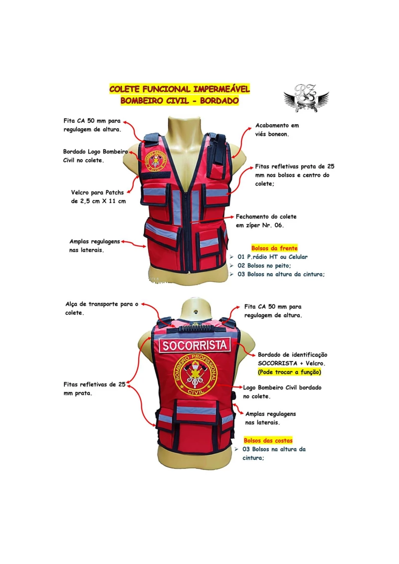 Possui bordado de identificação na frente do colete na altura do peito e nas costas do colete.