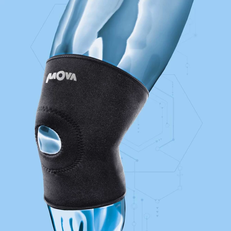 A Joelheira Neo com Orifício e Reforço Patelar MOVA foi desenvolvida especialmente para proporcionar proteção e calor localizado na área coberta pela peça ortopédica.