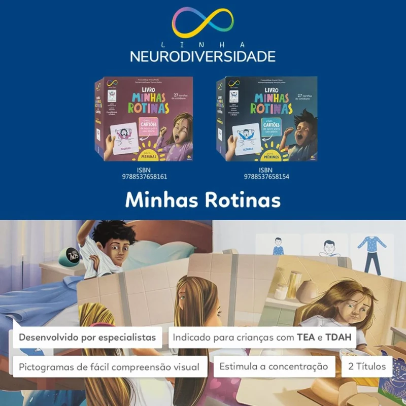 Neurodiversidade: Minhas Rotinas: Para Meninos é uma linha elaborada para construir conhecimentos de forma inclusiva, respeitando as necessidades das crianças, especialmente aquelas com Autismo e TDAH. Os livros são seguros e resistentes, abordando temas relevantes com conteúdos desenvolvidos e testados por profissionais dedicados.