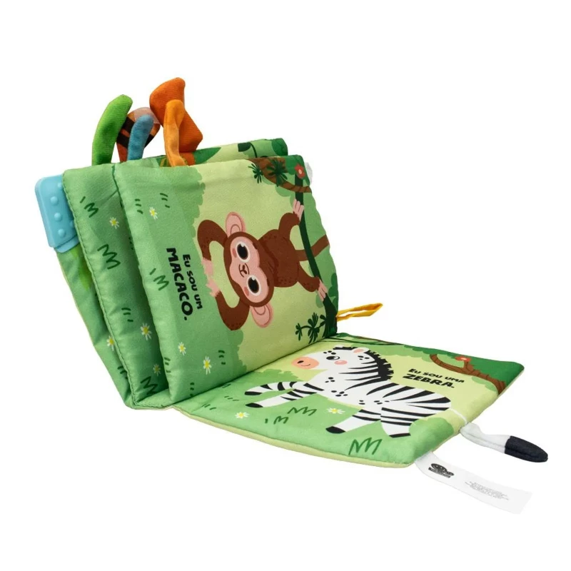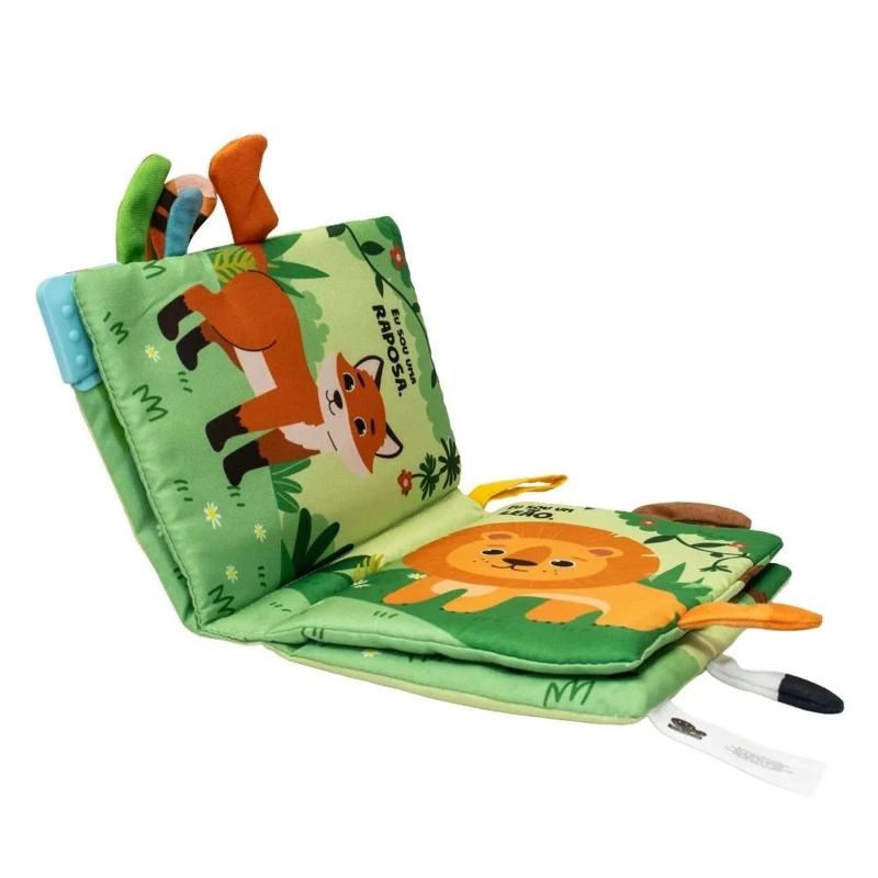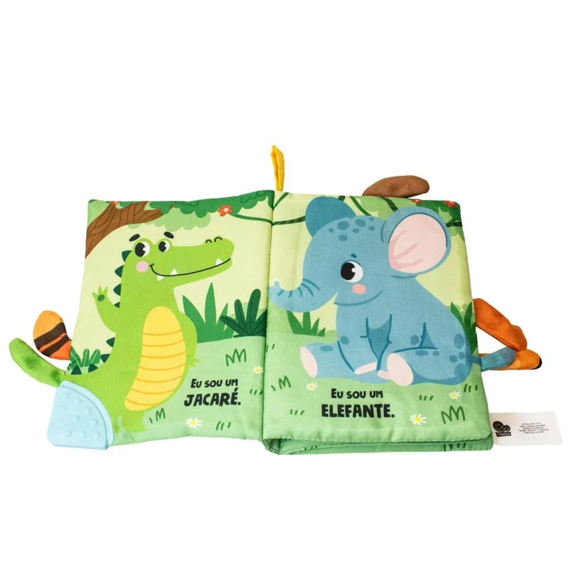 Acabamento: Livro de pano com mordedor. Embalagem plástica com fechamento adesivo.