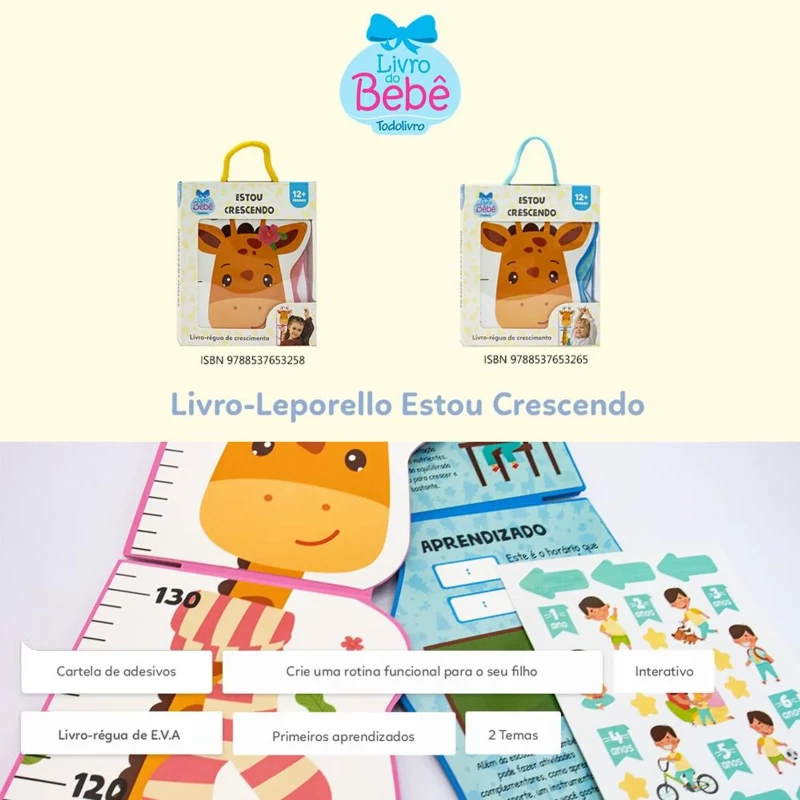 Livro-Leporello Estou Crescendo é um livro-régua interativo para acompanhar o crescimento e o desenvolvimento da criança de forma divertida e prática, podendo ser fixado na parede. O conteúdo também traz dicas sobre rotina infantil, abordando alimentação saudável, sono adequado, estímulo à leitura e atividades físicas.