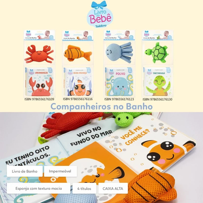 Companheiros no Banho: Peixe-palhaço é um livro para o bebê conhecer, por meio da repetição do conjunto padrão de forma e de cor e da textura macia de uma esponja peixe-palhaço, um pouco sobre este animal do fundo do mar.