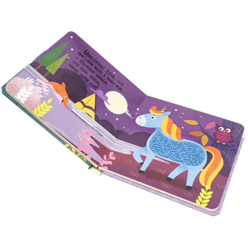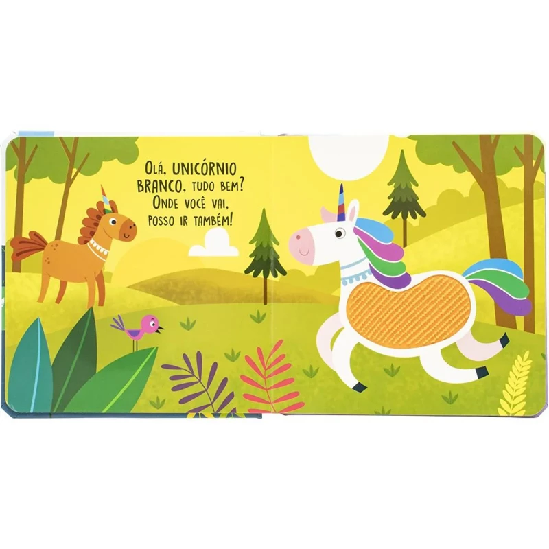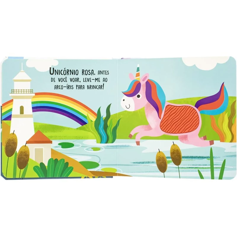 Na ponta dos dedos: Unicórnios é um livro que incentiva tocar e sentir. Em cada página, a criança pode tocar a superfície de silicone para explorar diferentes texturas.