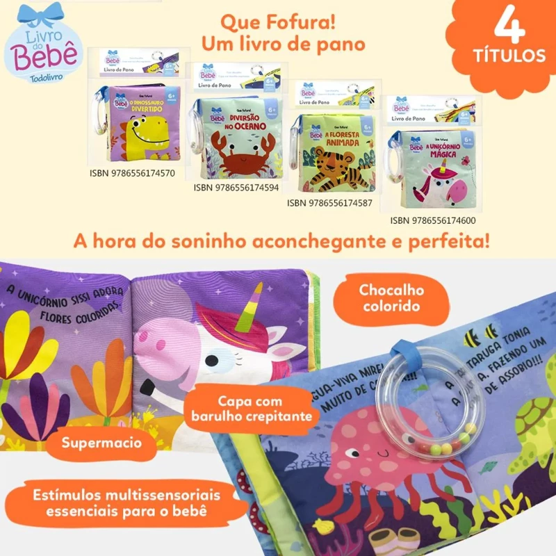 Acabamento: Livro de pano com capa crepitante e chocalho. Embalagem com fechamento em adesivo.