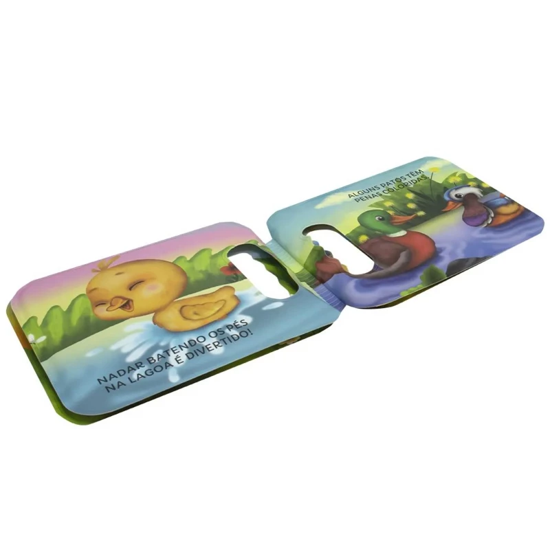 Acabamento: Livro impermeável com faca especial e capa com personagem em alto-relevo.