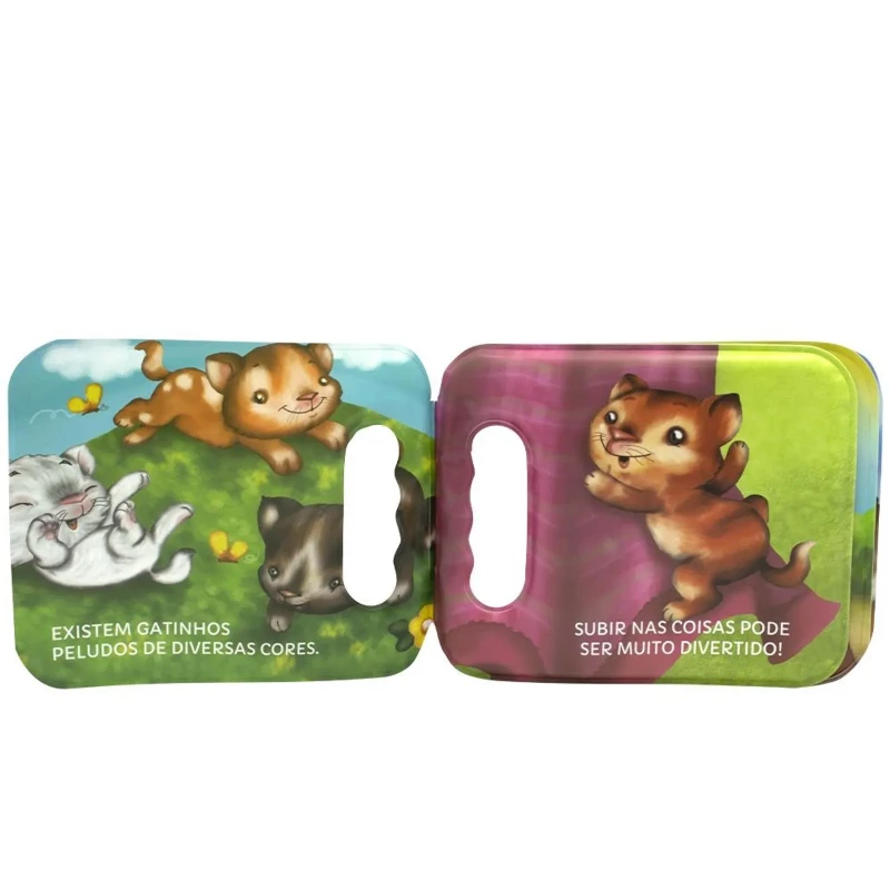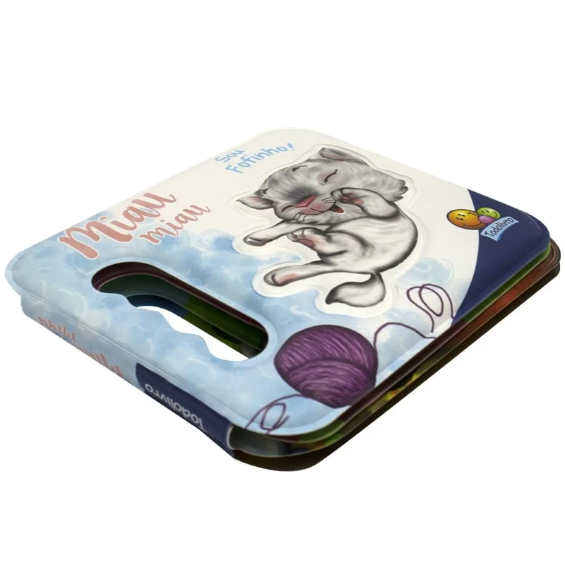 Acabamento: Livro impermeável com faca especial e capa com personagem em alto-relevo.