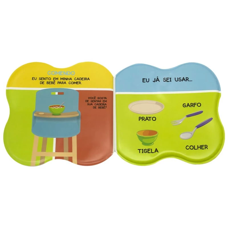 Dia a dia do Bebê - Um Livro de Banho: Comendo é um livro de banho que apresenta a rotina do bebê com uma pergunta para incentivar a interação durante a leitura.