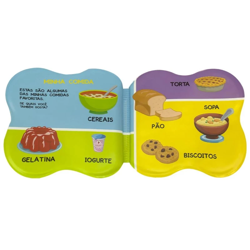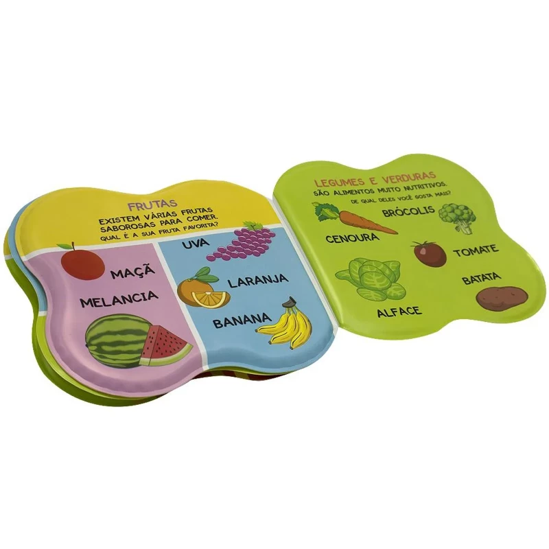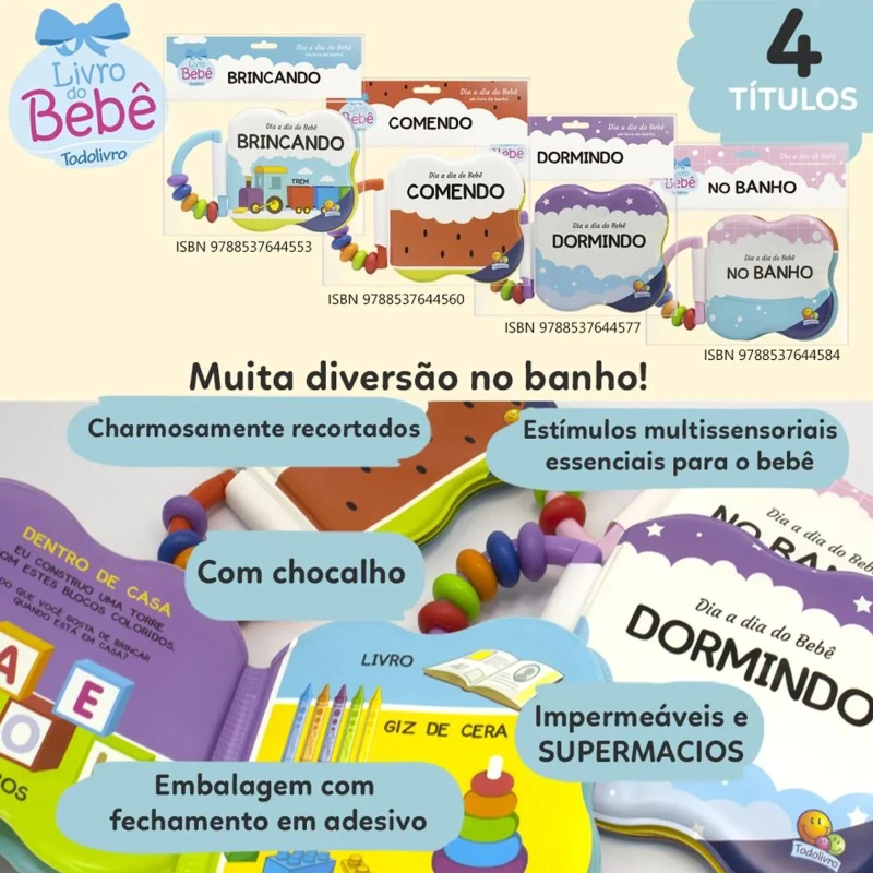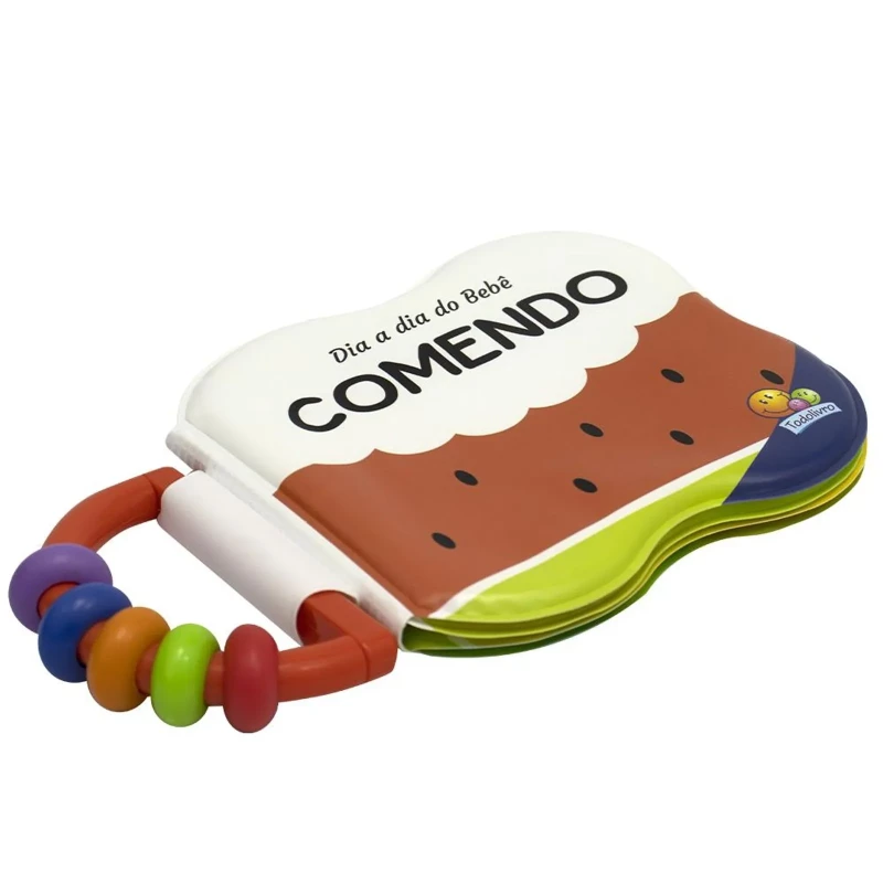 Acabamento: Livro de banho impermeável com chocalho e faca especial.