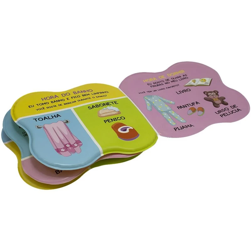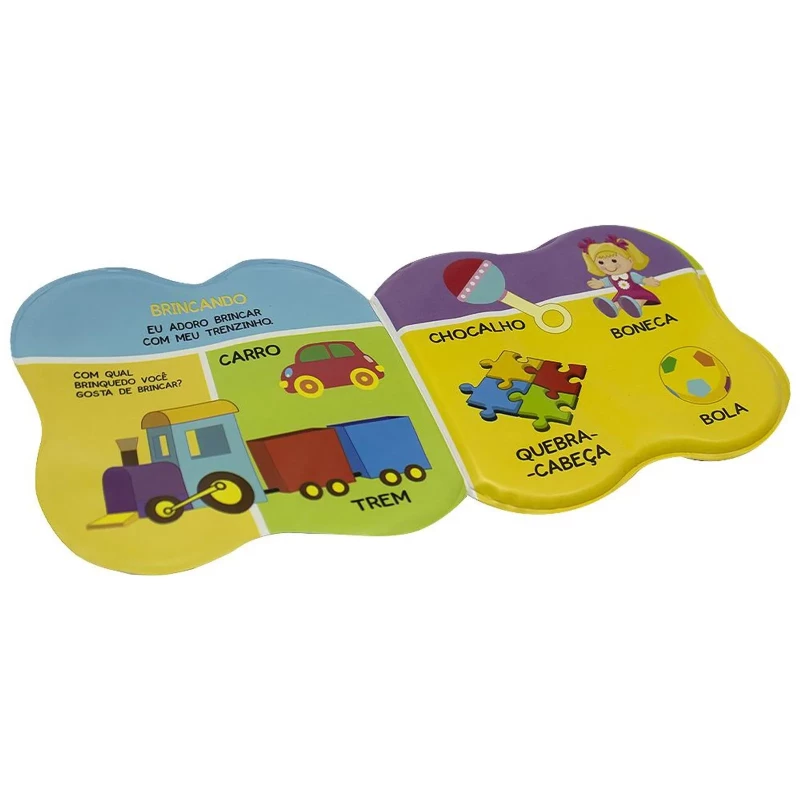 Acabamento: Livro de banho impermeável com chocalho e faca especial.