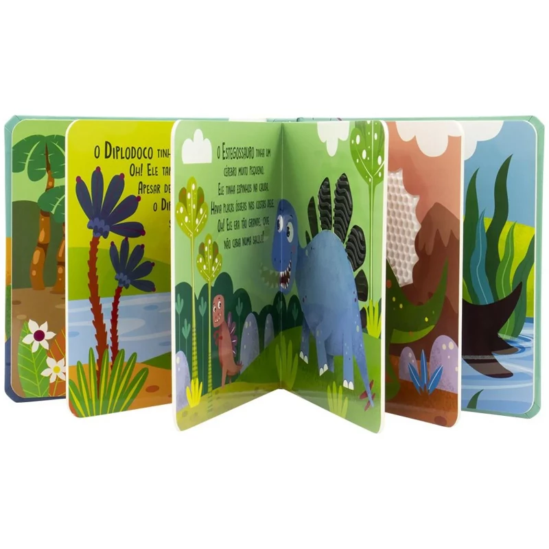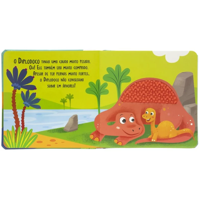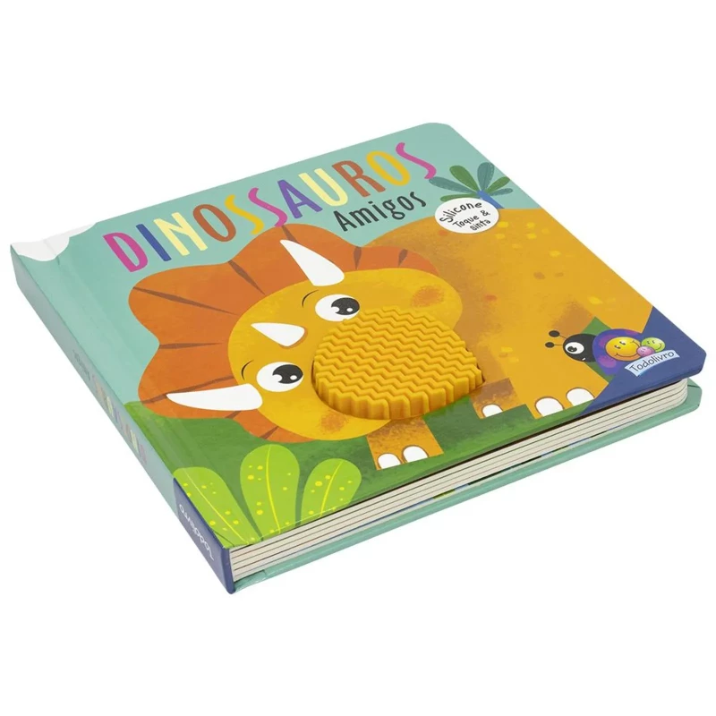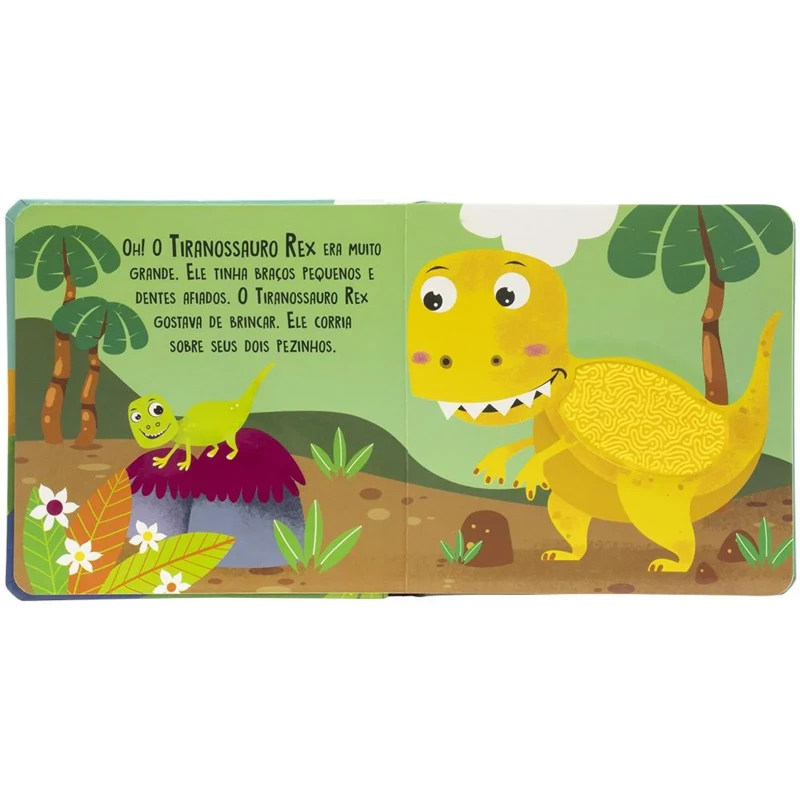 Na ponta dos dedos: Dinossauros Amigos é um livro que incentiva tocar e sentir. Em cada página, a criança pode tocar a superfície de silicone para explorar diferentes texturas.