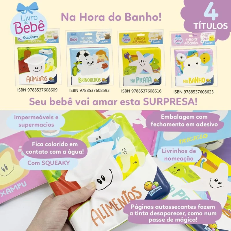 Na hora do banho II: No banho é um livrinho que fica colorido em contato com água, estimulando a curiosidade do bebê e ajudando a descobrir as primeiras palavras de forma inovadora.