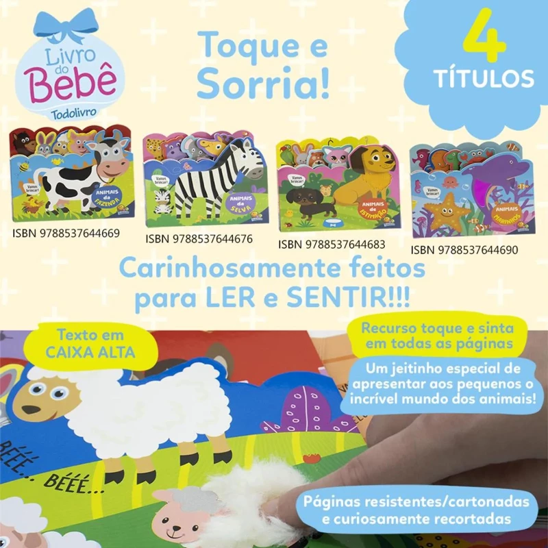 Toque e Sorria: Animais da Fazenda é um livrinho com ilustrações alegres e supercoloridas para as crianças explorarem enquanto sentem o pelo macio dos simpáticos animais. Perfeito para mãozinhas que gostam de explorar e aprender.