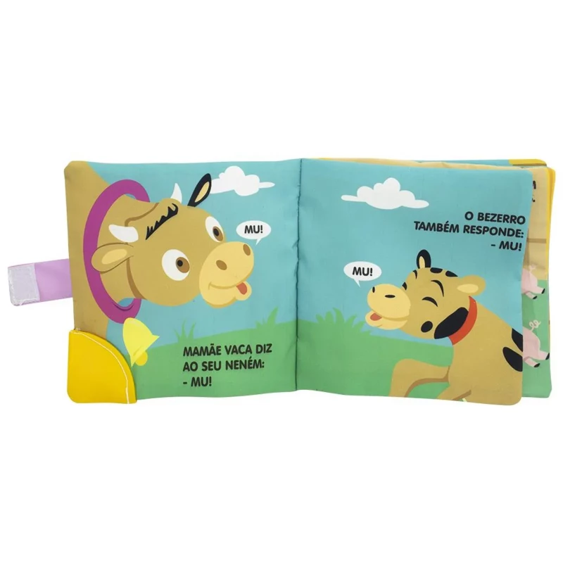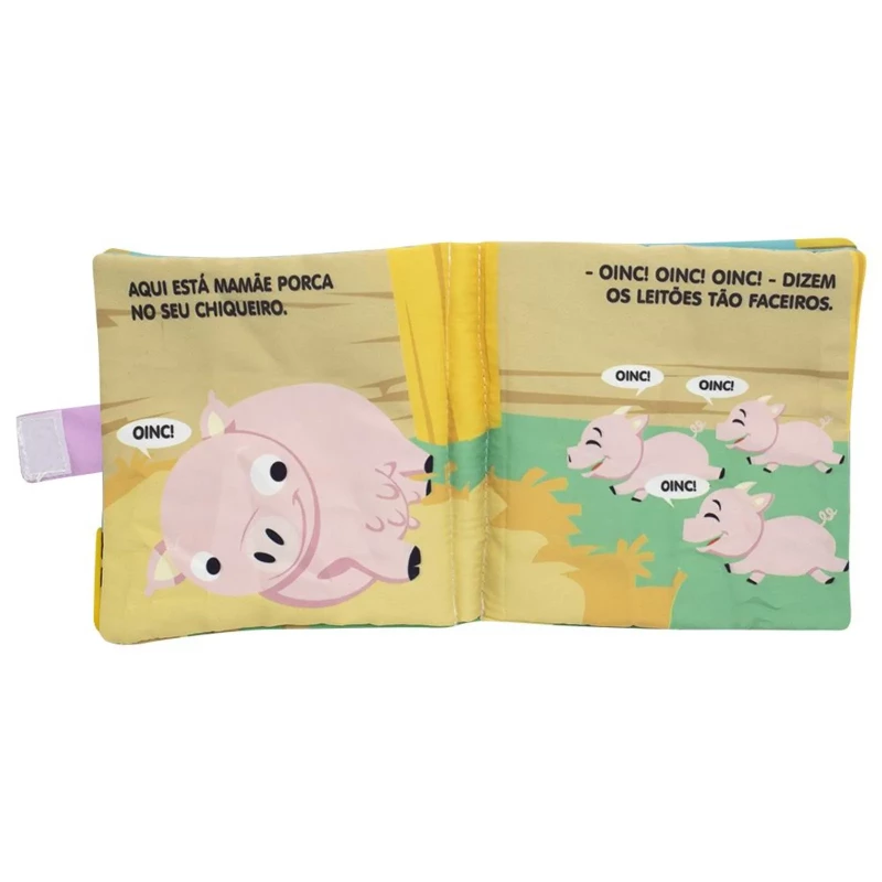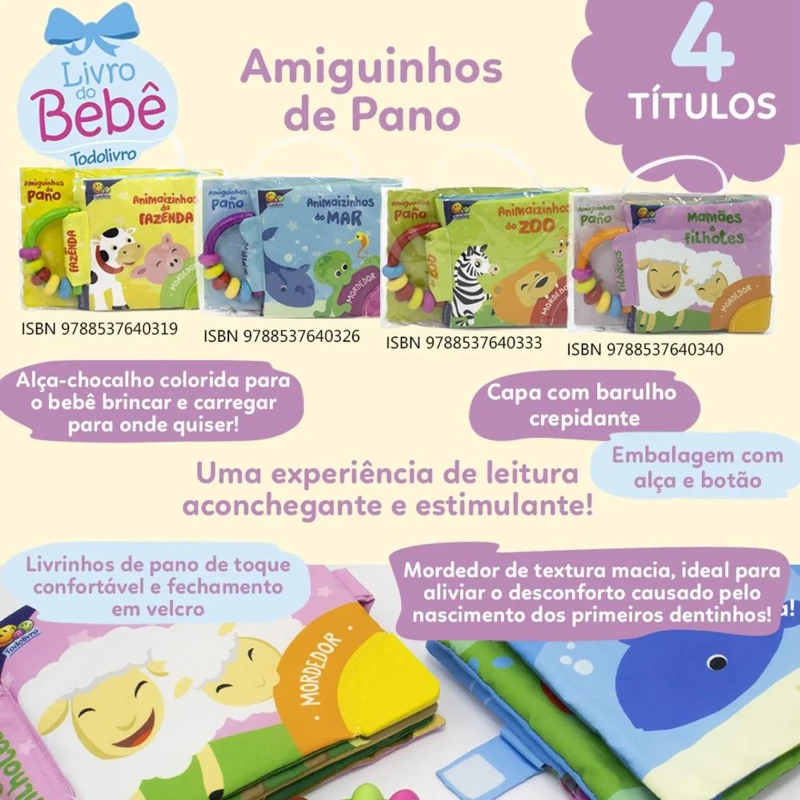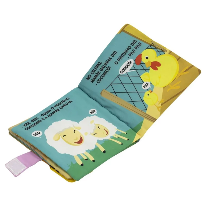 Acabamento: Livro de pano com alça-chocalho, mordedor, capa com barulho crepitante. Embalagem com alça e botão.