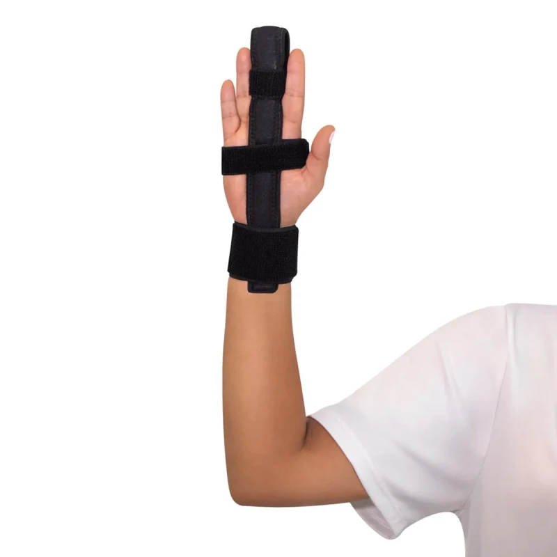 Coloque a tala na área inferior da mão, posicionando-a da palma do dedo até o pulso. Fixe primeiro o dedo atingido e, em seguida, ajuste as faixas na altura da palma da mão e depois no pulso.