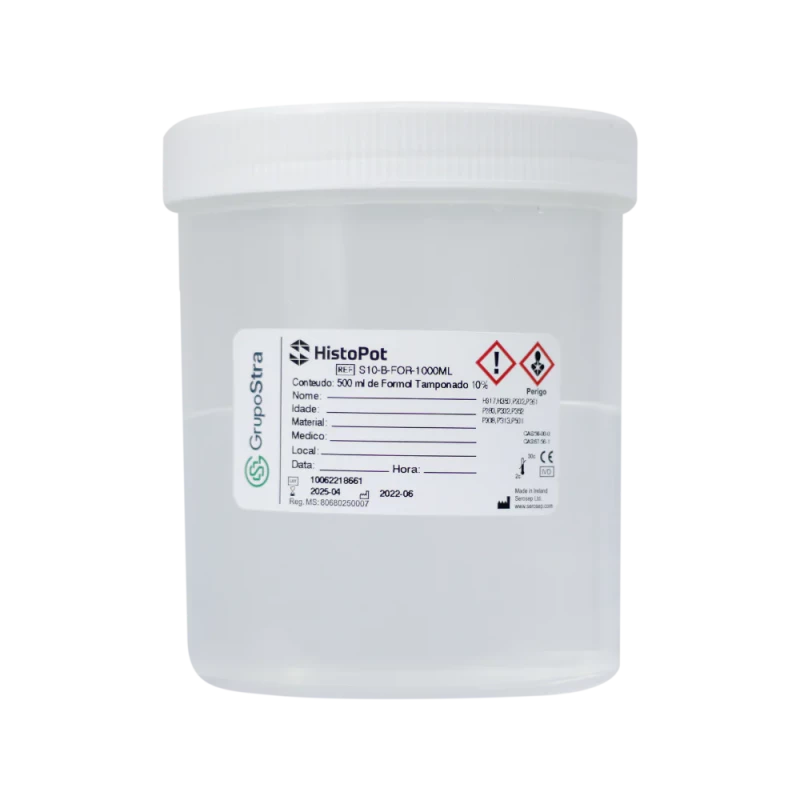 O HistoPot® é a solução ideal para profissionais que buscam padronização e confiabilidade no armazenamento e transporte de biópsias e peças cirúrgicas. Com frascos plásticos rígidos de alta qualidade, antivazamento e pré-rotulados, ele contém formol tamponado 10% (pH 7,0 a 7,4), garantindo fixação eficiente e preservação das características morfológicas celulares e moleculares.